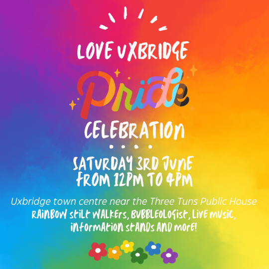 Join us for a day of family fun on Saturday 3rd June Uxbridge town centre near the Three Tuns Public House from 12pm to 4pm for our mini Pride Celebration!
