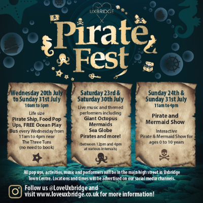 On Saturday 30th July there will be Aphrodite, Singing Mermaids, Pirates on Stilts and Sambattalion - the Pirate band! All acts and performances will be at various intervals from 1pm to 5pm.